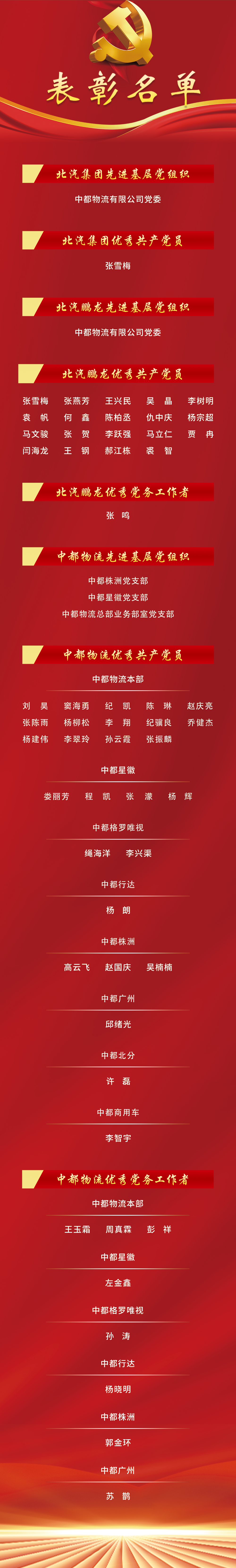會議宣讀《關于表彰2023-2024年度先進基層黨組織、優(yōu)秀共產黨員、優(yōu)秀黨務工作者的決定》,大會授予中都星徽黨支部等3個基層黨組織“中都物流先進基層黨組織”稱號,授予劉昊等27名同志“中都物流優(yōu)秀共產黨員”稱號,授予王玉霜等7名同志“中都物流優(yōu)秀黨務工作者”稱號,樹立“向先進看齊,尊重榜樣,學習榜樣”的鮮明導向。京內受表彰的先進集體和個人出席大會,先進基層黨組織代表、優(yōu)秀共產黨員進行交流發(fā)言(完整名單附后)。